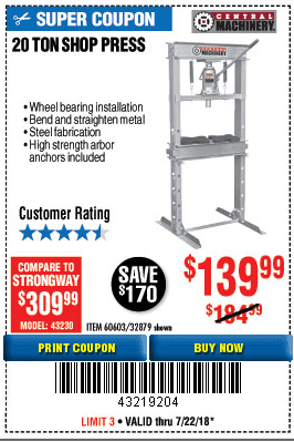 20 TON SHOP PRESS Lot No. 32879/60603 Expired: 6/30/18 - $139.99 Coupon Code: '10307067'