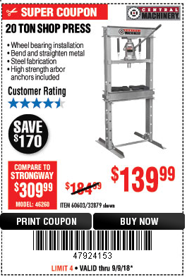 20 TON SHOP PRESS Lot No. 32879/60603 Expired: 9/9/18 - $139.99 Coupon Code: '47924153'