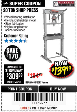 20 TON SHOP PRESS Lot No. 32879/60603 Expired: 10/31/18 - $139.99 Coupon Code: '30826622'