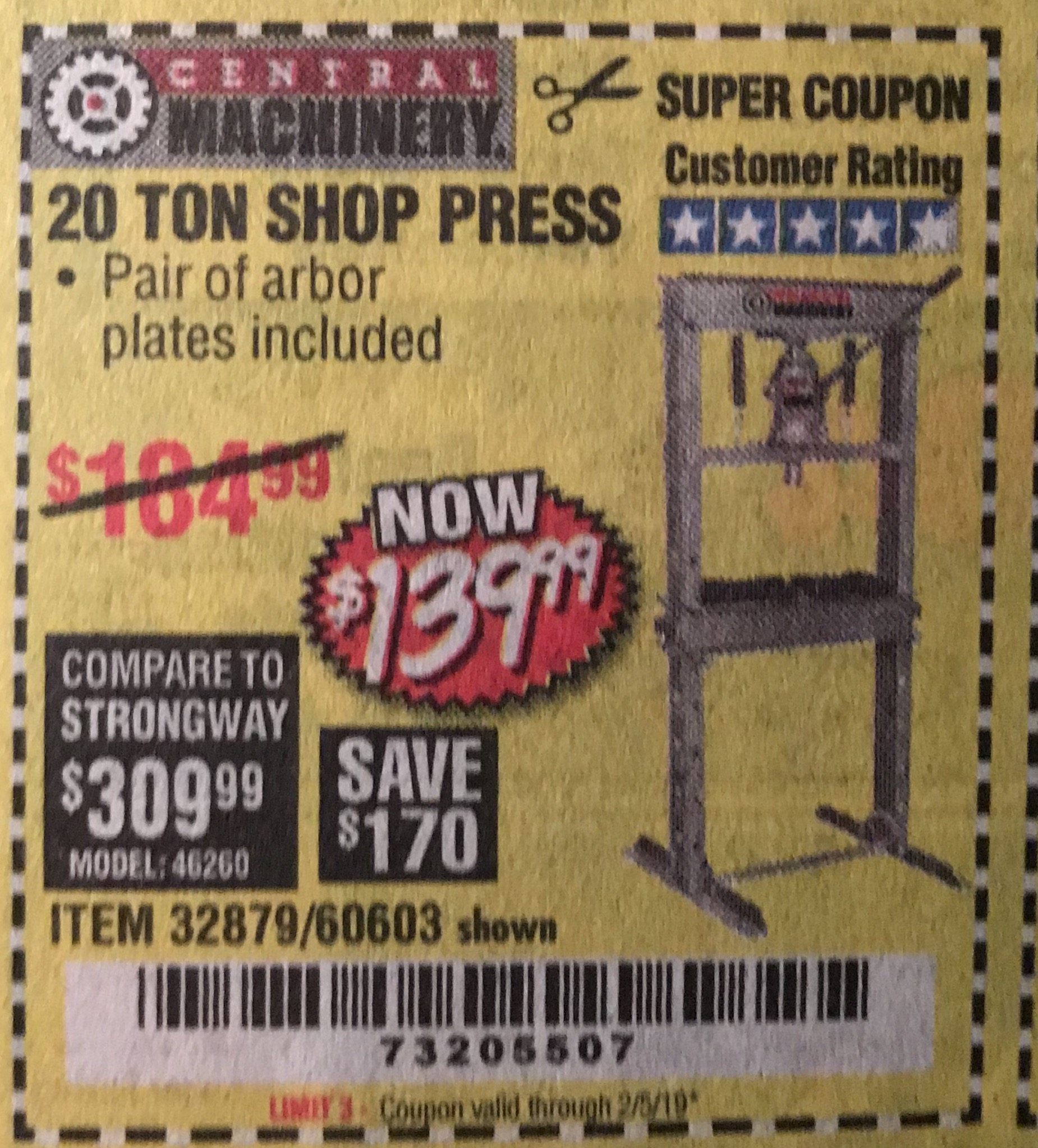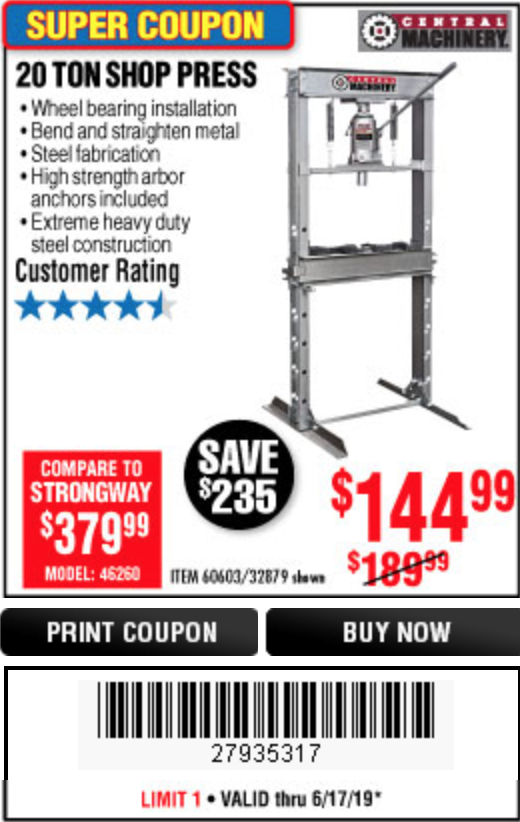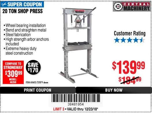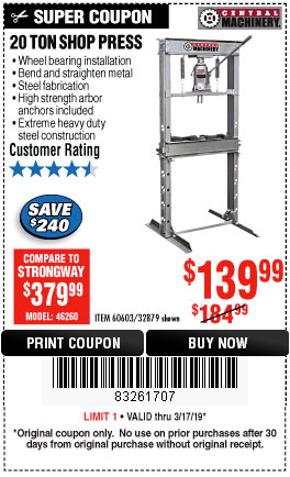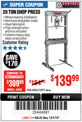 20 TON SHOP PRESS Lot No. 32879/60603 Expired: 2/5/19 - $139.99 Coupon Code: '73205507'