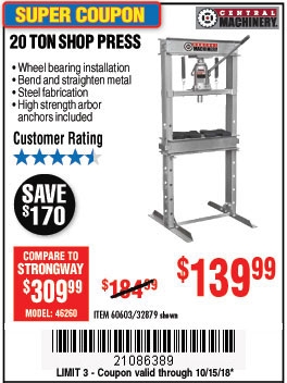 20 TON SHOP PRESS Lot No. 32879/60603 Expired: 10/15/18 - $139.99 Coupon Code: '21086389'
