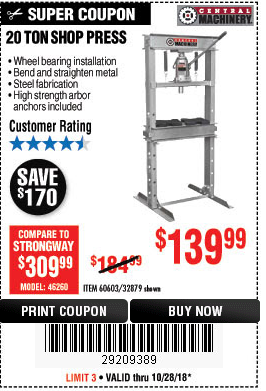 20 TON SHOP PRESS Lot No. 32879/60603 Expired: 10/28/18 - $139.99 Coupon Code: '29209389'