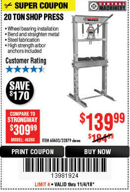 20 TON SHOP PRESS Lot No. 32879/60603 Expired: 11/4/18 - $139.99 Coupon Code: '13981924'