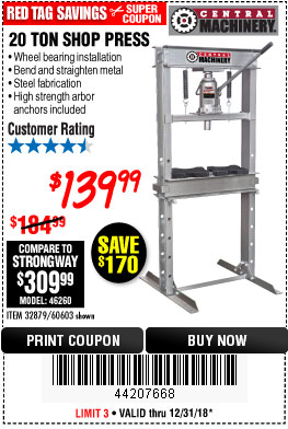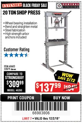 20 TON SHOP PRESS Lot No. 32879/60603 Expired: 12/20/18 - $139.99 Coupon Code: '41169556'
