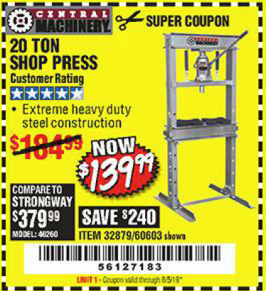 20 TON SHOP PRESS Lot No. 32879/60603 Expired: 8/5/19 - $139.99 Coupon Code: '56127183'