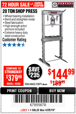 20 TON SHOP PRESS Lot No. 32879/60603 Expired: 4/28/19 - $144.99 Coupon Code: '67855678'