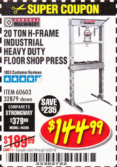 20 TON SHOP PRESS Lot No. 32879/60603 Expired: 6/30/19 - $144.99 Coupon Code: '33302722'