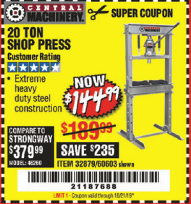 20 TON SHOP PRESS Lot No. 32879/60603 Expired: 10/21/19 - $144.99 Coupon Code: '21187688'