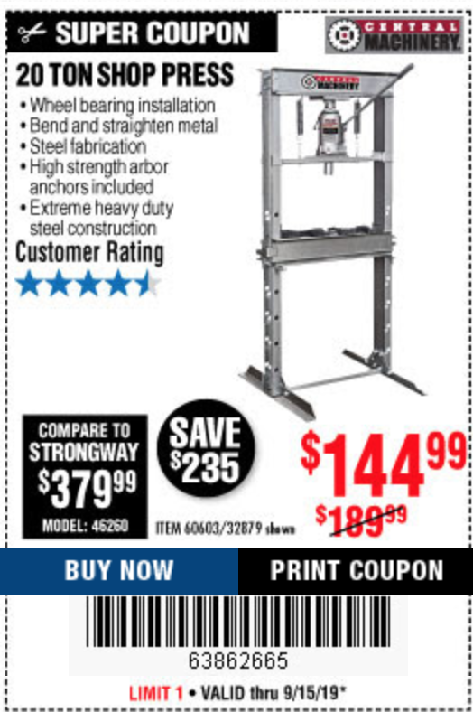 20 TON SHOP PRESS Lot No. 32879/60603 Expired: 9/15/19 - $144.99 Coupon Code: '63862665'