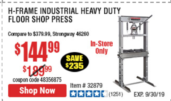 20 TON SHOP PRESS Lot No. 32879/60603 Expired: 9/30/19 - $144.99 Coupon Code: '48356875'