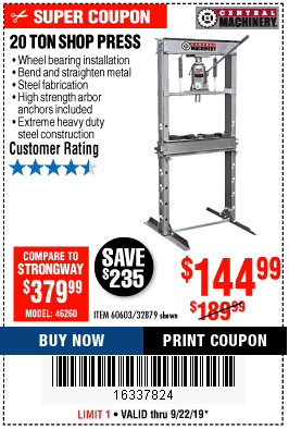 20 TON SHOP PRESS Lot No. 32879/60603 Expired: 9/22/19 - $144.99 Coupon Code: '16337824'