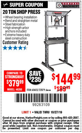 20 TON SHOP PRESS Lot No. 32879/60603 Expired: 10/27/19 - $144.99 Coupon Code: '99263109'