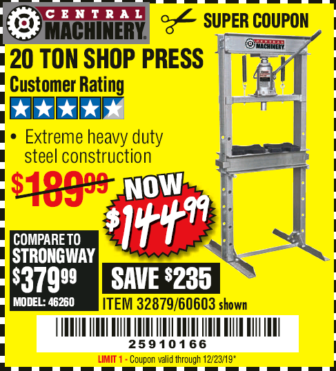 20 TON SHOP PRESS Lot No. 32879/60603 Expired: 12/23/19 - $144.99 Coupon Code: '25910166'