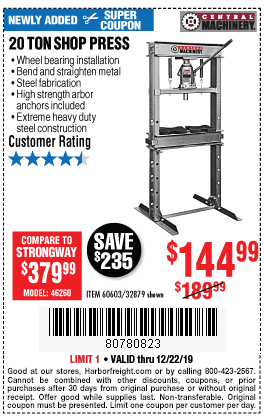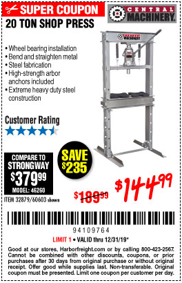20 TON SHOP PRESS Lot No. 32879/60603 Expired: 12/31/19 - $144.99 Coupon Code: '94109764'