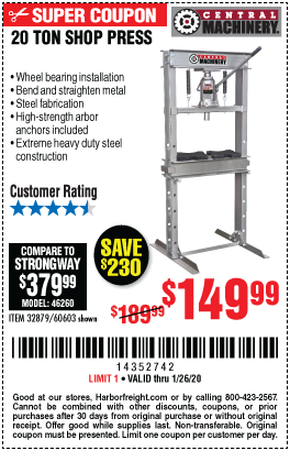20 TON SHOP PRESS Lot No. 32879/60603 Expired: 1/26/20 - $149.99 Coupon Code: '14352742'