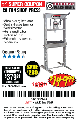 20 TON SHOP PRESS Lot No. 32879/60603 Expired: 3/8/20 - $149.99 Coupon Code: '78057270'