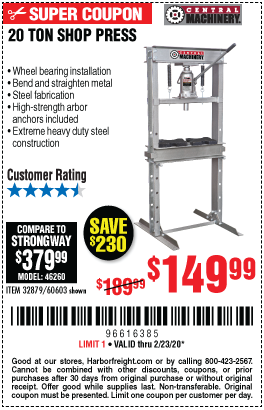 20 TON SHOP PRESS Lot No. 32879/60603 Expired: 2/29/20 - $149.99 Coupon Code: '40379208'