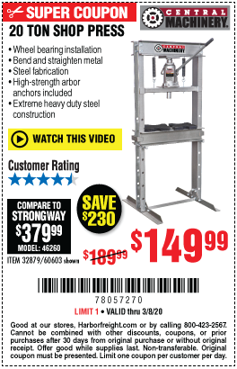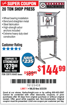 20 TON SHOP PRESS Lot No. 32879/60603 Expired: 3/22/20 - $144.99 Coupon Code: '77726621'