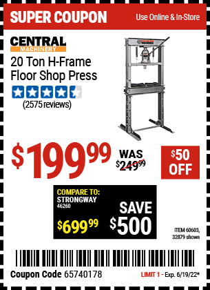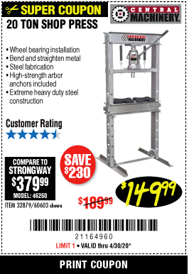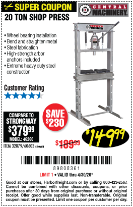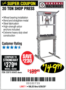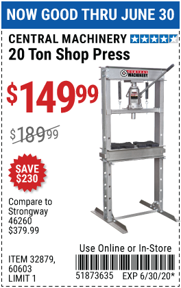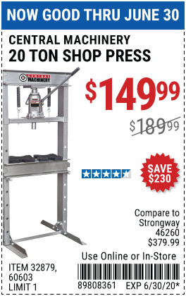 20 TON SHOP PRESS Lot No. 32879/60603 Expired: 6/30/20 - $149.99 Coupon Code: '2427247'