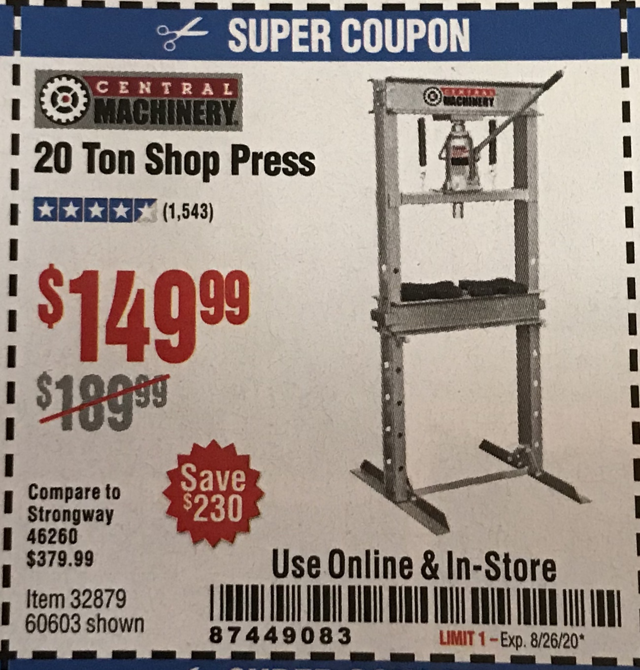 20 TON SHOP PRESS Lot No. 32879/60603 Expired: 8/26/20 - $149.99 Coupon Code: '87449083'