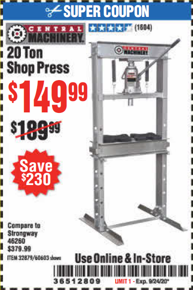 20 TON SHOP PRESS Lot No. 32879/60603 Expired: 9/24/20 - $149.99 Coupon Code: '36512809'