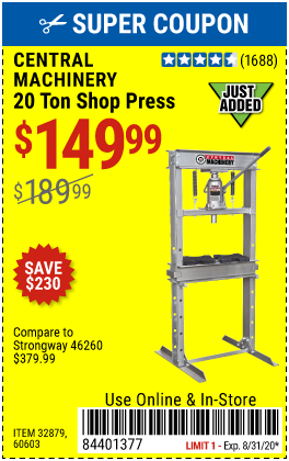 20 TON SHOP PRESS Lot No. 32879/60603 Expired: 8/31/20 - $149.99 Coupon Code: '84401377'