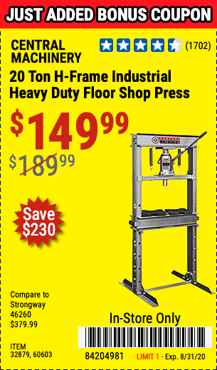 20 TON SHOP PRESS Lot No. 32879/60603 Expired: 8/31/20 - $149.99 Coupon Code: '84204981'