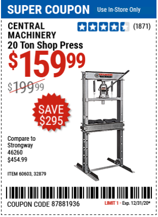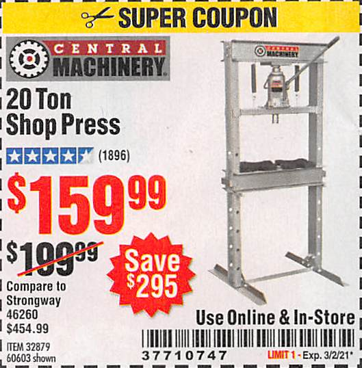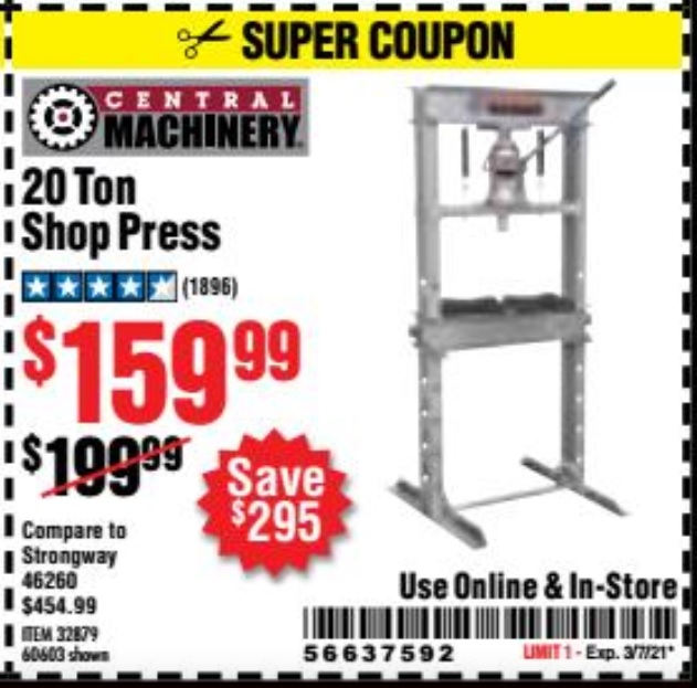 20 TON SHOP PRESS Lot No. 32879/60603 Expired: 12/31/20 - $159.99 Coupon Code: '87881936'