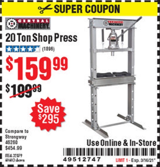 20 TON SHOP PRESS Lot No. 32879/60603 Expired: 3/16/21 - $159.99 Coupon Code: '49512747'