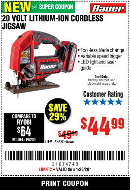 20 VOLT CORDLESS JIG SAW Lot No. 63630 Expired: 1/26/20 - $44.99 Coupon Code: '31074748'