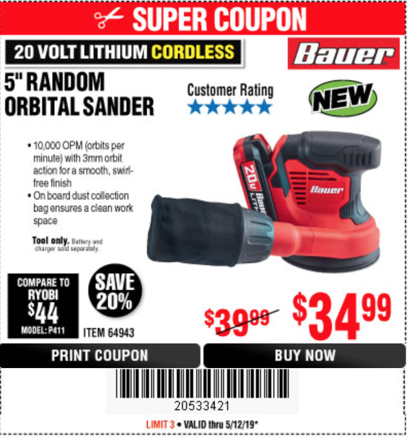 20 VOLT LITHIUM CORADLESS 5" RANDOM ORBIT SANDER Lot No. 64943 Expired: 5/12/19 - $34.99 Coupon Code: '20533421'