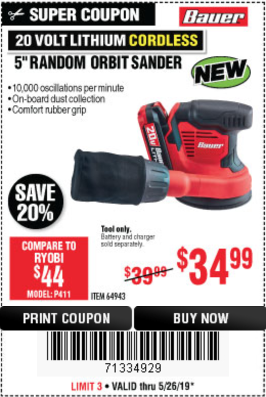 20 VOLT LITHIUM CORADLESS 5" RANDOM ORBIT SANDER Lot No. 64943 Expired: 5/31/19 - $34.99 Coupon Code: '61747020'