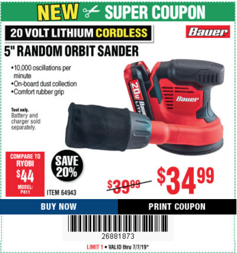20 VOLT LITHIUM CORADLESS 5" RANDOM ORBIT SANDER Lot No. 64943 Expired: 6/30/19 - $34.99 Coupon Code: '28472477'