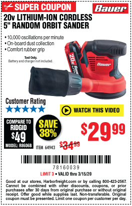 20 VOLT LITHIUM CORADLESS 5" RANDOM ORBIT SANDER Lot No. 64943 Expired: 3/15/20 - $29.99 Coupon Code: '78160039'