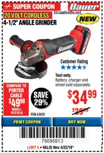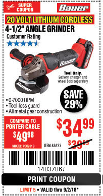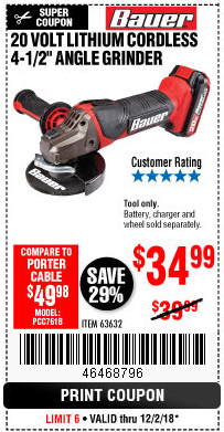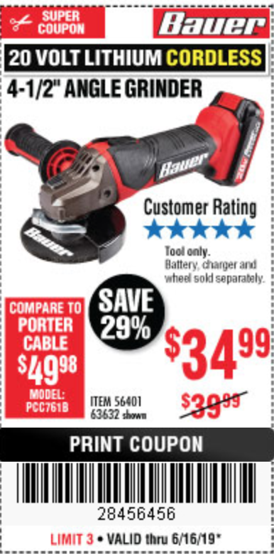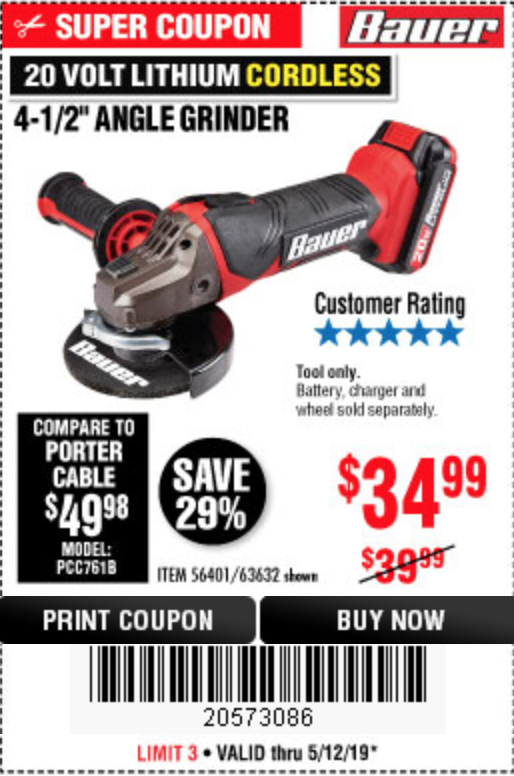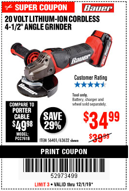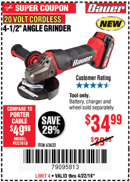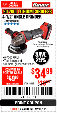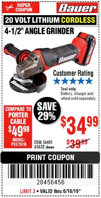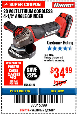 20 VOLT LITHIUM CORDLESS 4-1/2" ANGLE GRINDER Lot No. 63632 Expired: 6/16/19 - $34.99 Coupon Code: '28456456'