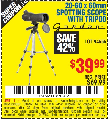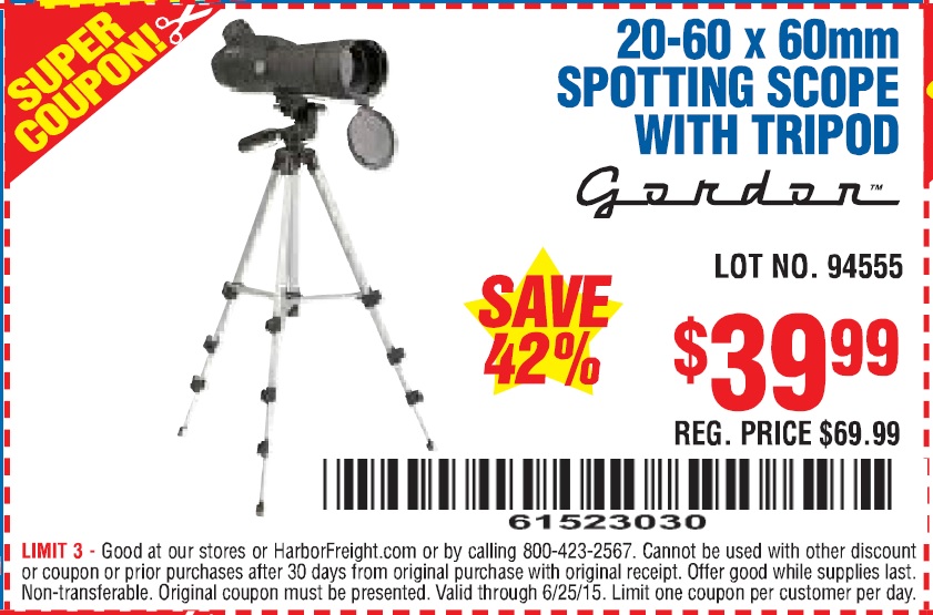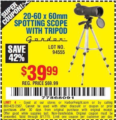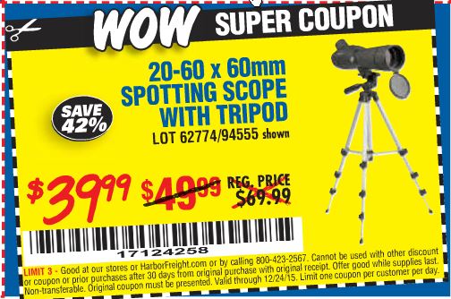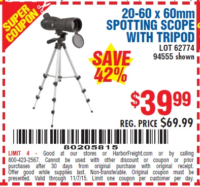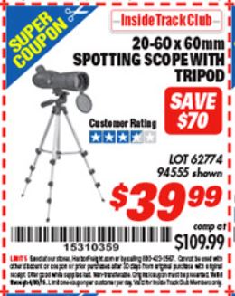 20-60 X 60 MM SPOTTING SCOPE WITH TRIPOD Lot No. 62774 Expired: 6/25/15 - $39.99 Coupon Code: '61523030'