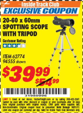 20-60 X 60 MM SPOTTING SCOPE WITH TRIPOD Lot No. 62774 Expired: 6/8/17 - $39.99 Coupon Code: '54267549'