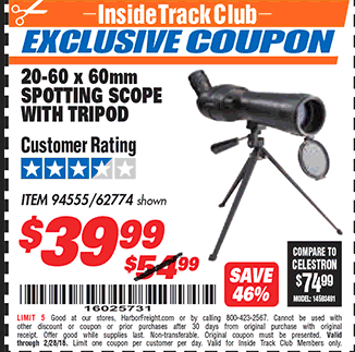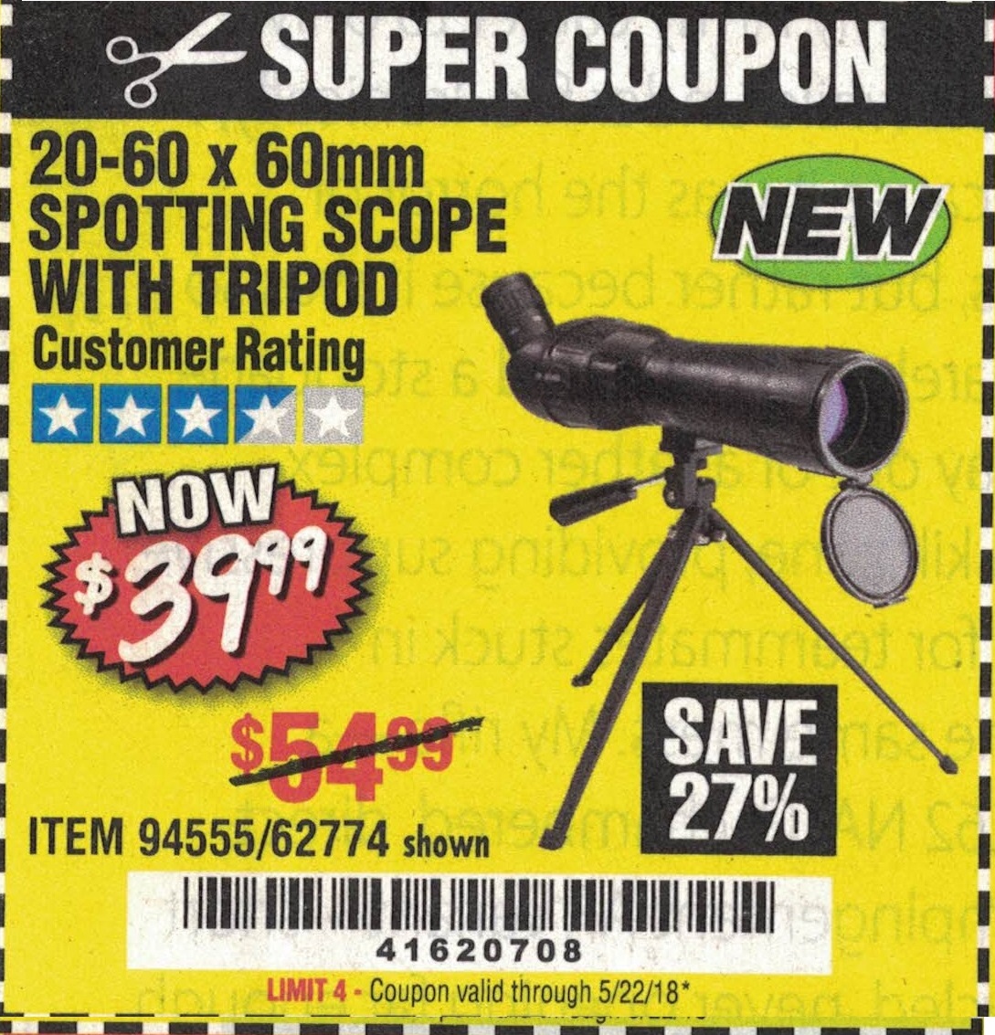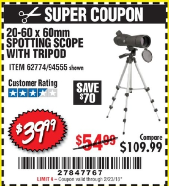 20-60 X 60 MM SPOTTING SCOPE WITH TRIPOD Lot No. 62774 Expired: 2/23/18 - $39.99 Coupon Code: '27847767'