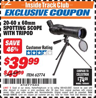 20-60 X 60 MM SPOTTING SCOPE WITH TRIPOD Lot No. 62774 Expired: 7/31/20 - $39.99 Coupon Code: '60323402'