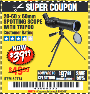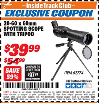 20-60 X 60 MM SPOTTING SCOPE WITH TRIPOD Lot No. 62774 Expired: 7/19/19 - $39.99 Coupon Code: '51731745'
