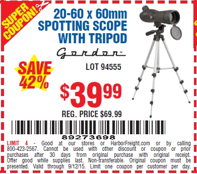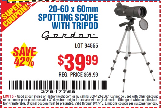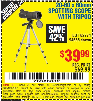 20-60 X 60 MM SPOTTING SCOPE WITH TRIPOD Lot No. 62774 Expired: 9/17/15 - $39.99 Coupon Code: '27817758'