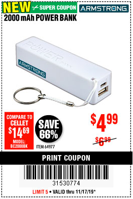 2000 MAH POWER BANK Lot No. 64977 Expired: 11/17/19 - $4.99 Coupon Code: '31530774'