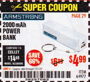 2000 MAH POWER BANK Lot No. 64977 Expired: 1/31/20 - $4.99 Coupon Code: '39257082'