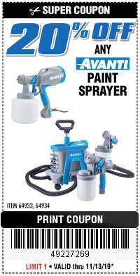 20PCT OFF ANY AVANTI PAINT SPRAYER Lot No. 64933/64934 Expired: 11/13/19 - $0 Coupon Code: '49227269'