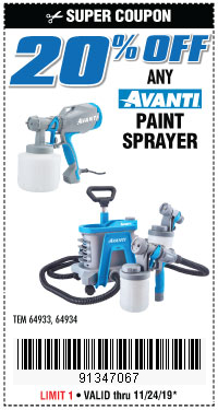 20PCT OFF ANY AVANTI PAINT SPRAYER Lot No. 64933/64934 Expired: 11/24/19 - $0 Coupon Code: '91347067'