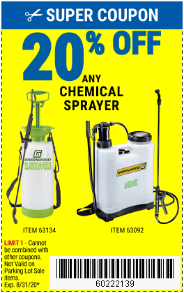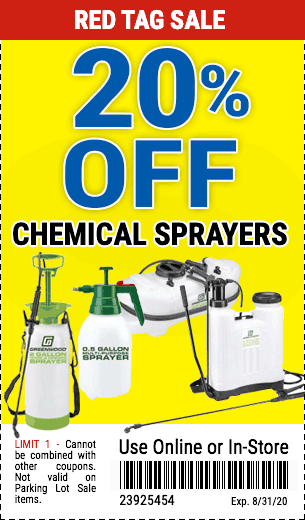 20PCT OFF CHEMICAL SPRAYERS Lot No. 56167/95690/61281/63134/63092/65040/61368/63036/61263/9583/96302 Expired: 8/31/20 - $20 Coupon Code: '60222139'