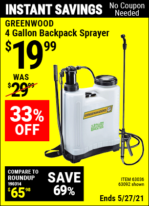 20PCT OFF CHEMICAL SPRAYERS Lot No. 56167/95690/61281/63134/63092/65040/61368/63036/61263/9583/96302 Expired: 4/29/21 - $19.99 Coupon Code: 'n/a'