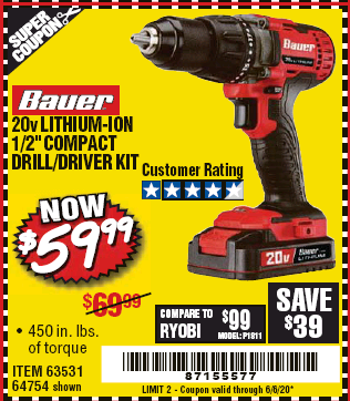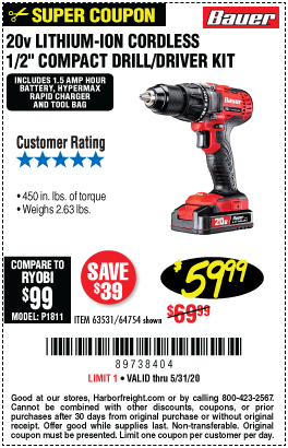 20V DRILL DRIVER Lot No. 63531 Expired: 6/30/20 - $59.99 Coupon Code: '89738404'