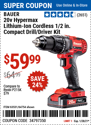 20V DRILL DRIVER Lot No. 63531 Expired: 1/28/21 - $59.99 Coupon Code: '34797350'
