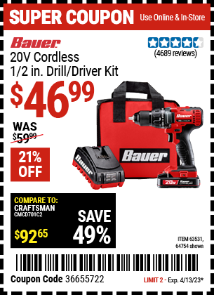 20V DRILL DRIVER Lot No. 63531 Expired: 4/13/23 - $46.99 Coupon Code: '36655722'